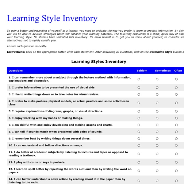 Three&basic&types&of&learning&styles:&& Presentthe&learning&style&inventory&(see&appendix&A).&&Each&studenthas©&of&the&16*question& inventory.&Following&are&options&to&facilitate&inventory:& a. ... View Document